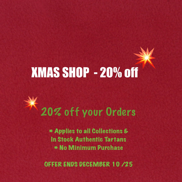 Our Xmas Shop includes everything in the store at 20% off the regular price... Custom Orders with in stock Authentic tartans, Canadian tartans, the Canada Maple Collection and the new Simple Denim. Find unique one of a kind club covers in Playing A'Round or something for apres golf in Accessories. We will be adding more choices in scarves and bags in the next few weeks so check back often.